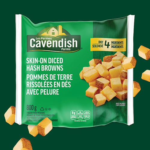 Crispy on the outside, fluffy on the inside, and only containing 4 ingredients, Cavendish Farms Skin-on Diced Hash Browns are flavourful, versatile and ready for any occasion. Made in Canada from domestic and imported ingredients.
