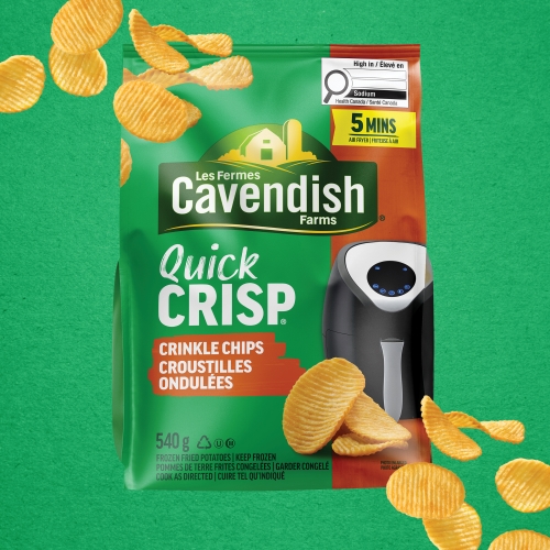The hottest New Chip is in the Freezer Aisle! Introducing the New Cavendish Farms Quick Crisp Crinkle Chips- warm, crispy and ready in just 5 minutes in the air fryer. Quick and easy to prepare, these chips deliver the perfect balance of crispy outside like a chip and potato flavour of a fry. Made in Canada from domestic and imported ingredients.