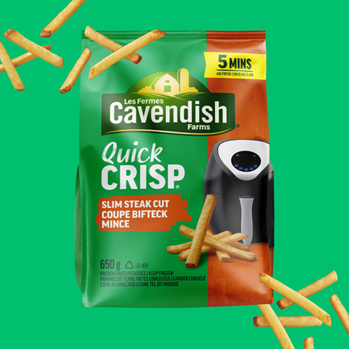 Craveably crispy and ready in just 5 minutes in the air fryer, Cavendish Farms Quick Crisp Slim Steak Cut Fries are versatile - perfect as a side or as a snack. Serve them up with your favourite dish or enjoy them solo—either way, they satisfy your cravings fast. Winner of the Canadian Grand Prix Award for Best New Product of 2024 for Frozen Sides and Appetizers. Made in Canada from domestic and imported ingredients.